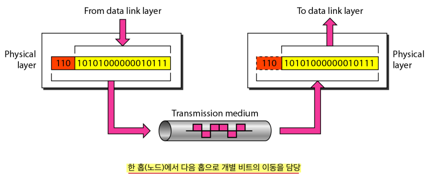 물리적인 계층은 한 홉(노드)에서 다음 홉으로 개별 비트의 이동을 담당한다