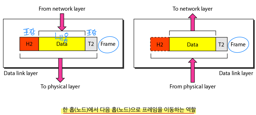 데이터 링크 계층은 한 node에서 다음 node로 프레임을 이동하는 역할을 한다.