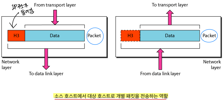 소스 호스트에서 대상 호스트로 개별 패킷을 전송하는 역할을 한다